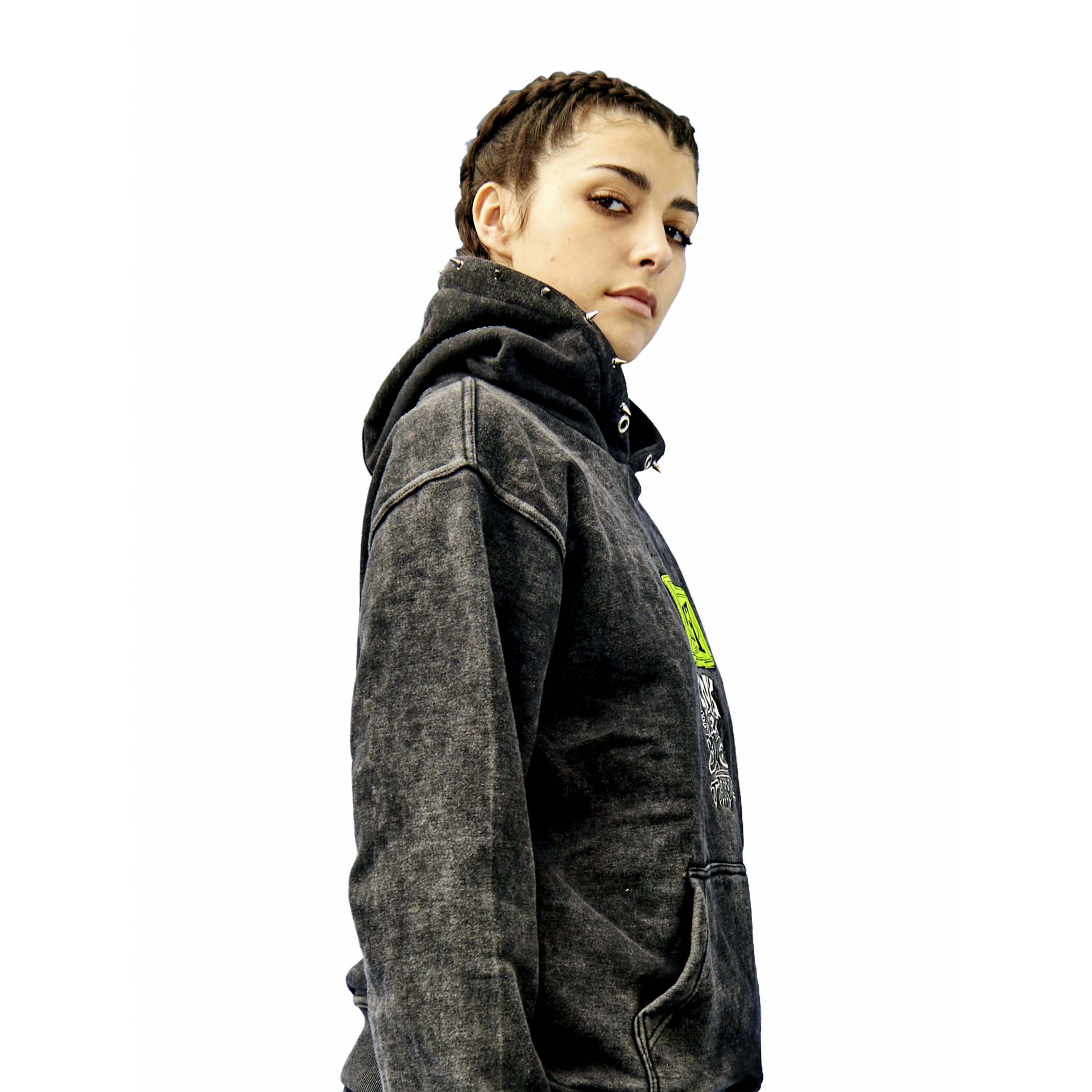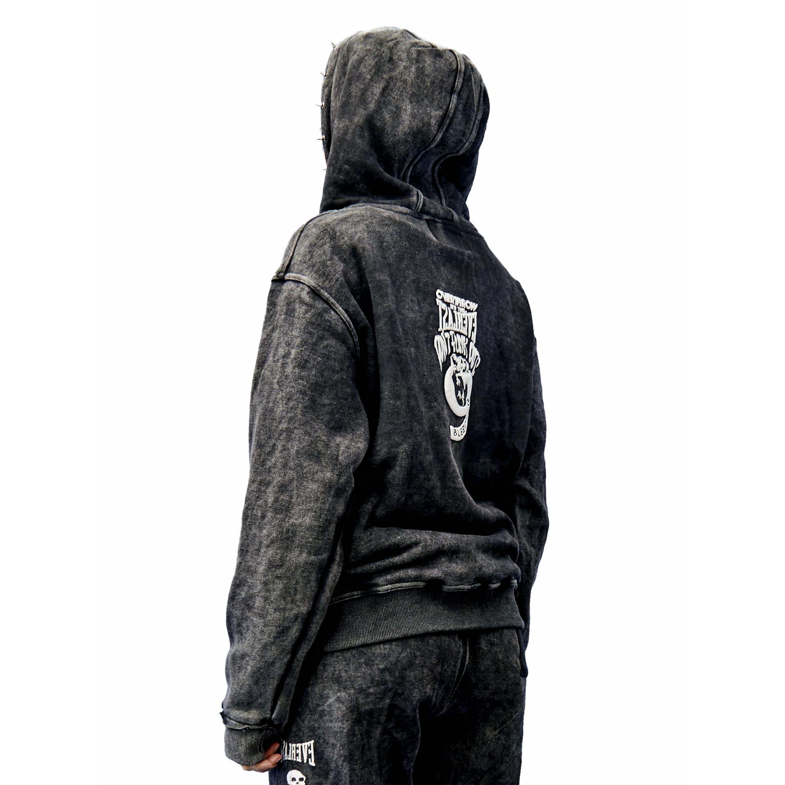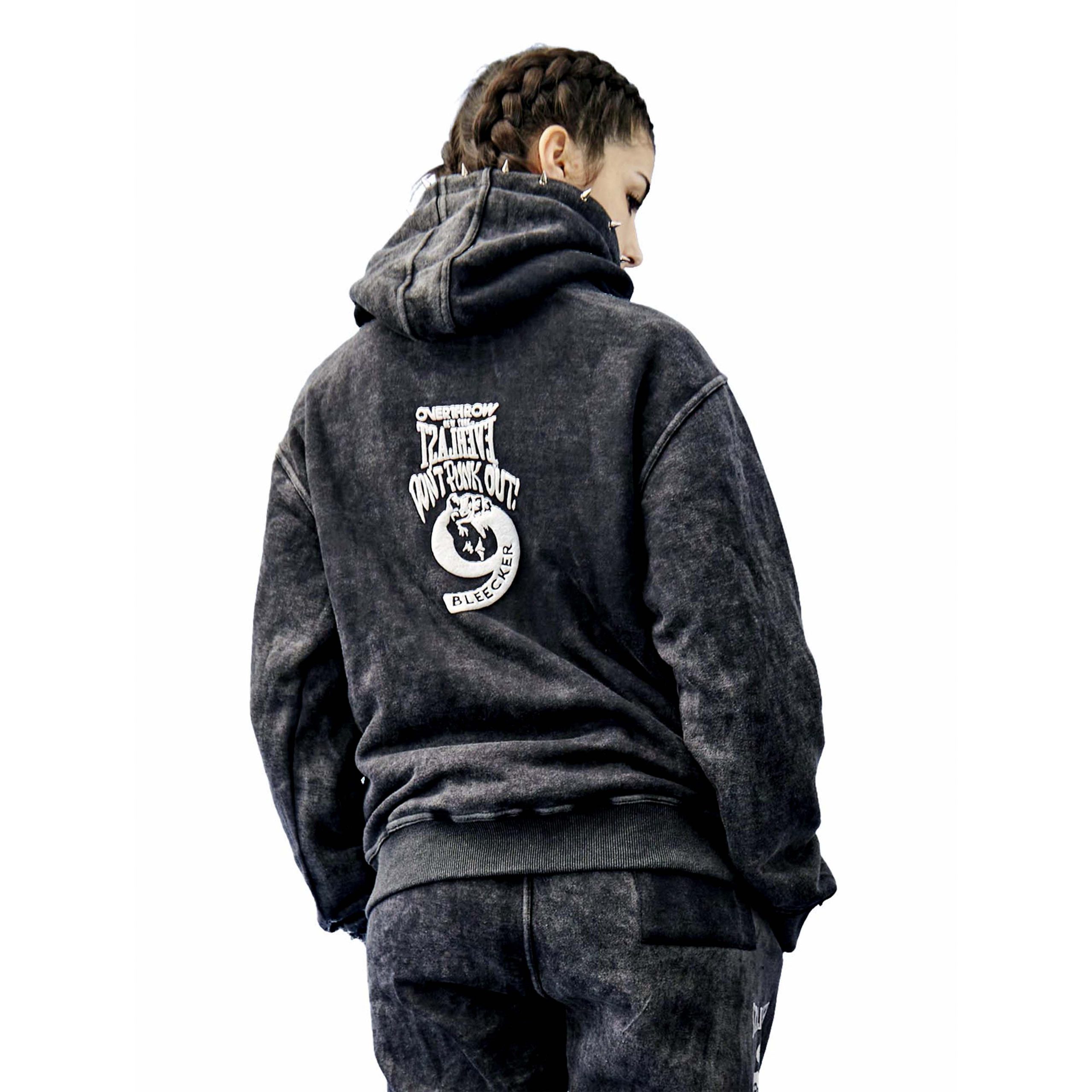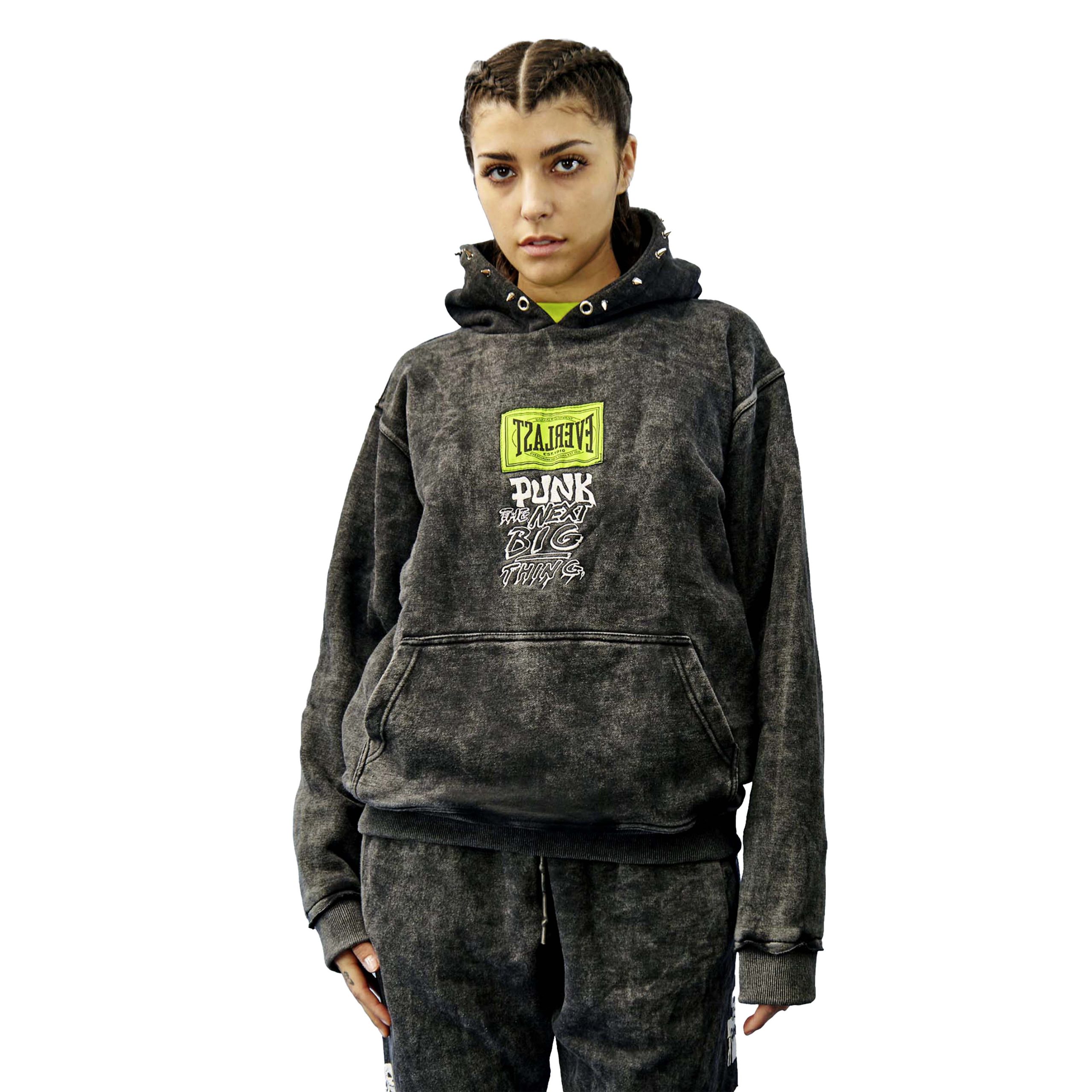 Overthrow X Everlast X Punk Oversize fit Fleece hoodie. 100% cotton with Embroidery and screen printed Graphics. Metal punk spikes lined around hood edge.
